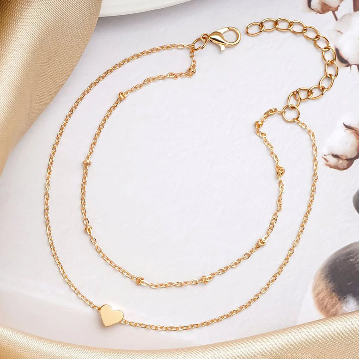 The Melody Heart Anklet is a sweet and subtle addition to any look. This delicate gold-tone piece features a two-layer design with a tiny, smooth heart charm centered on the lower chain. Perfect for layering love into your style.